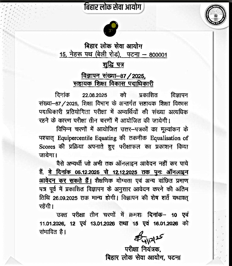 The Bihar Public Service Commission (BPSC) has announced the exam dates for the Assistant Education Development Officer (AEDO) Recruitment 2025 on its official website. The examination will be held on 10, 11, 12, 13, 15, and 16 January 2026.