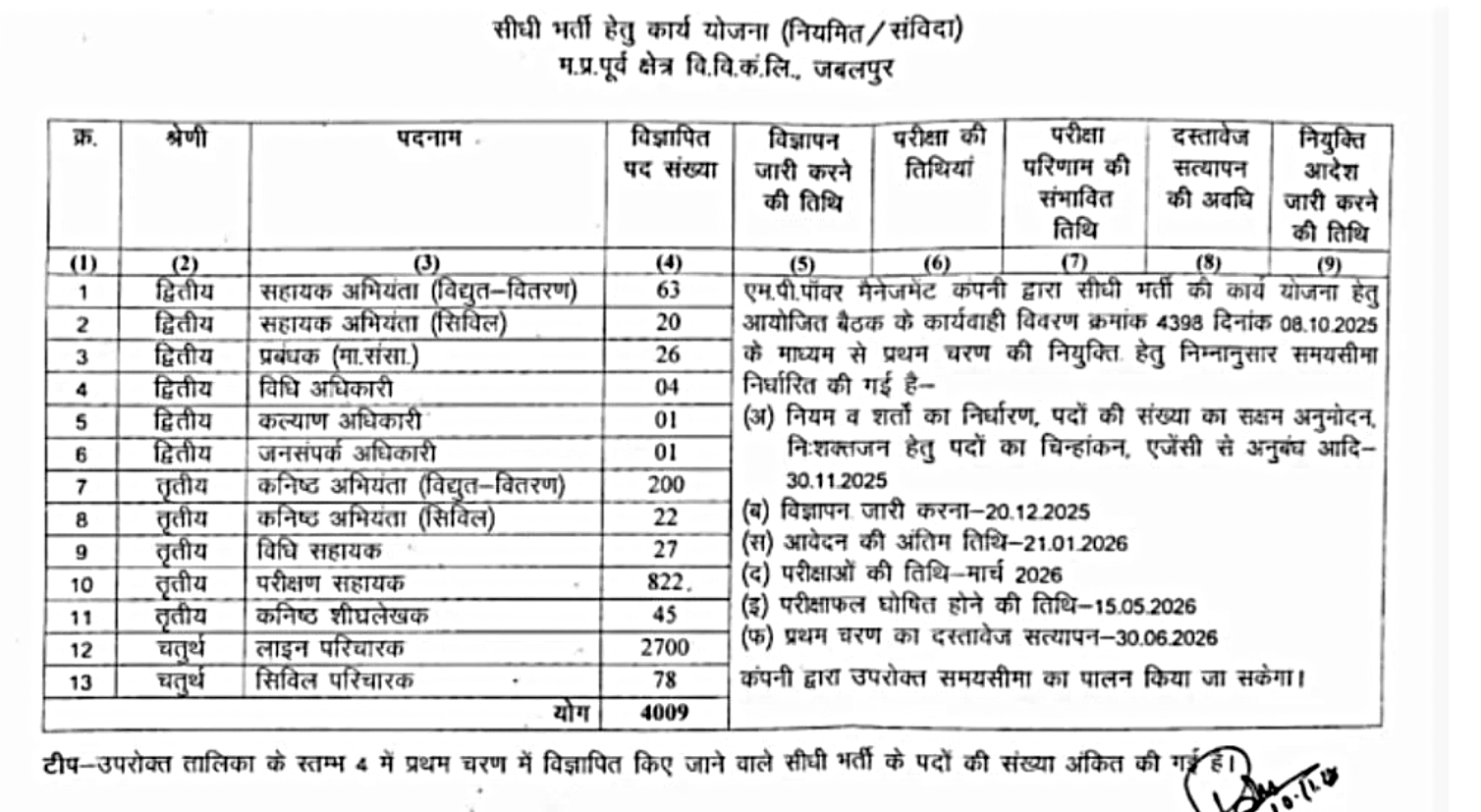 Madhya Pradesh Poorv Kshetra Vidyut Vitaran Company Limited (MPPKVVCL) सहायक इंजीनियर और जूनियर इंजीनियर 4009 पदों की भर्ती के लिए अधिसूचना जारी की गई है। वे उम्मीदवार जो इस अधिसूचना रिक्ति विवरण में रुचि रखते हैं और सभी पात्रता विवरण पूरा करते हैं, वे पूर्ण अधिसूचना पढ़ सकते हैं और सावधानीपूर्वक आवेदन कर सकते हैं।